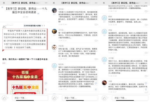 学院利用易班平台线上发帖,掀起十九届五中全会精神学习热潮。通过线上学习帖的呈现与分享,鼓励学生深刻理解、准确把握十九届五中全会精神,同学们利用易班评论专区发表学习心得,表达作为一名新时代的青年,要坚定理想信念,锤炼高尚品格,争做志存高远的追梦人的坚定决心。