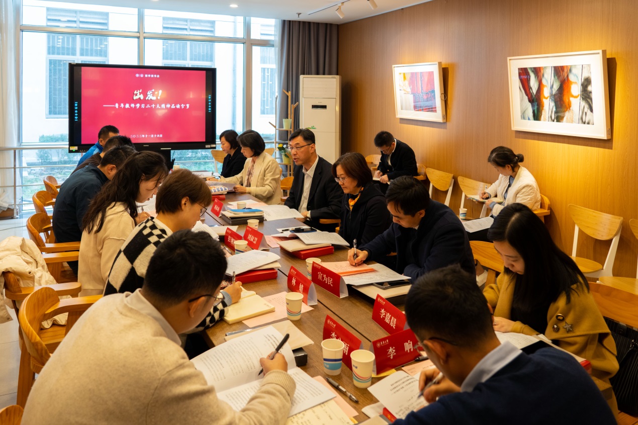 刘承功在领读时指出,要深入学习领会党的二十大报告精神,从中汲取“出发”的方向、目标、路径和动力,坚持落实立德树人根本任务,办好人民满意的教育,这是教育工作者要取得“满分”的考卷,离不开每一位老师的努力。要优化调整学科和专业布局,拓展学科发展、人才培养的新领域、新赛道,强化有组织科研,为服务国家发展与重大战略需求贡献东华力量。要营造健康的学术生态,实行有效的学术治理,以培养一流人才和产出一流成果为目标,全面推进学校创新体系建设。刘承功表示,青年教师充满创新活力和发展潜力,是学校人才队伍的生力军,学校会努力为青年教师从事教书育人事业提供更广阔的发展平台、更科学的评价导向、更有力的培养支持,营造促进青年教师成长的优良环境和氛围。